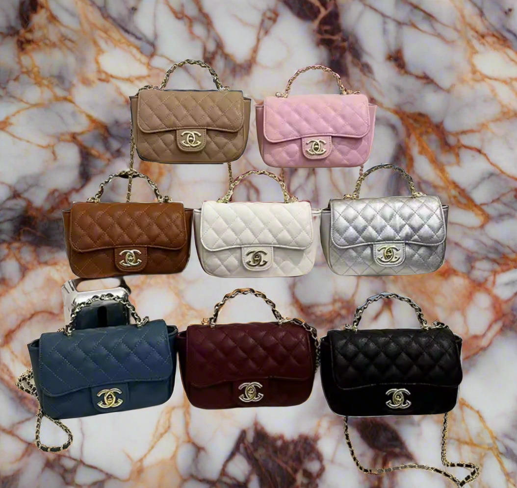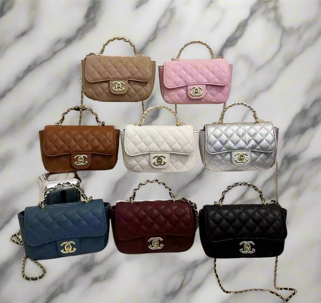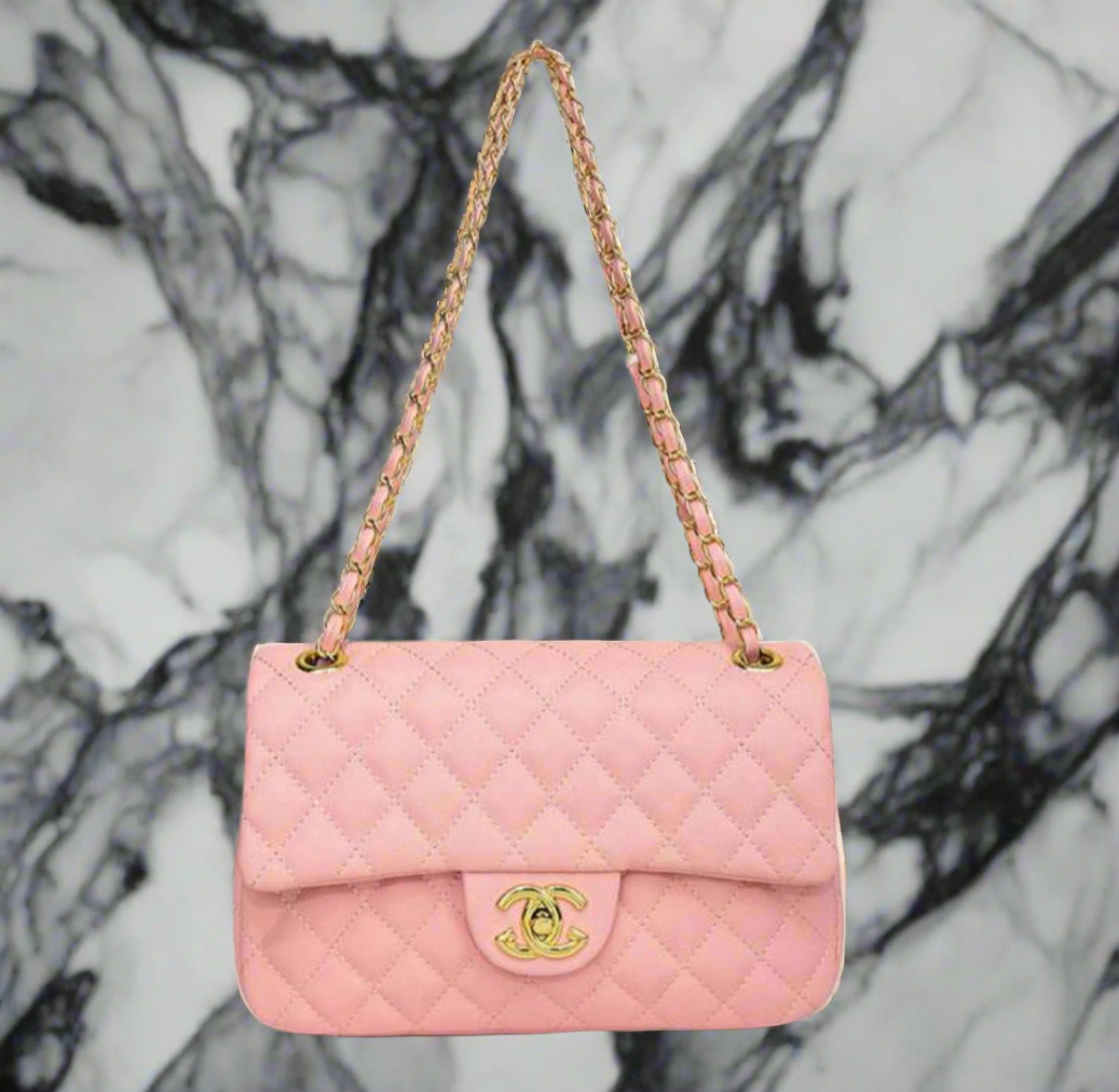 Classic quilted leather flap cross body bag with logo closure and double chain adjustable straps.