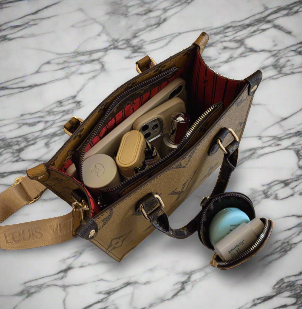 Leather tote bag with large monogram pattern. It features two long top handles (long enough to wear comfortably on your shoulder, or the nook of your elbow), as well as a matching long leather crossbody strap.