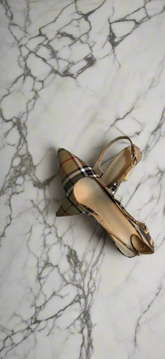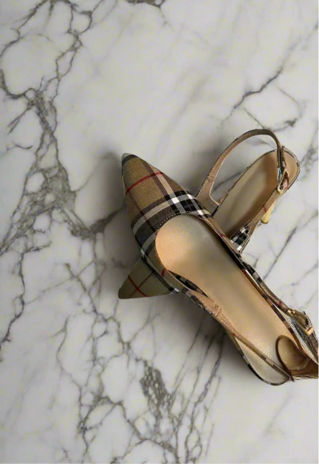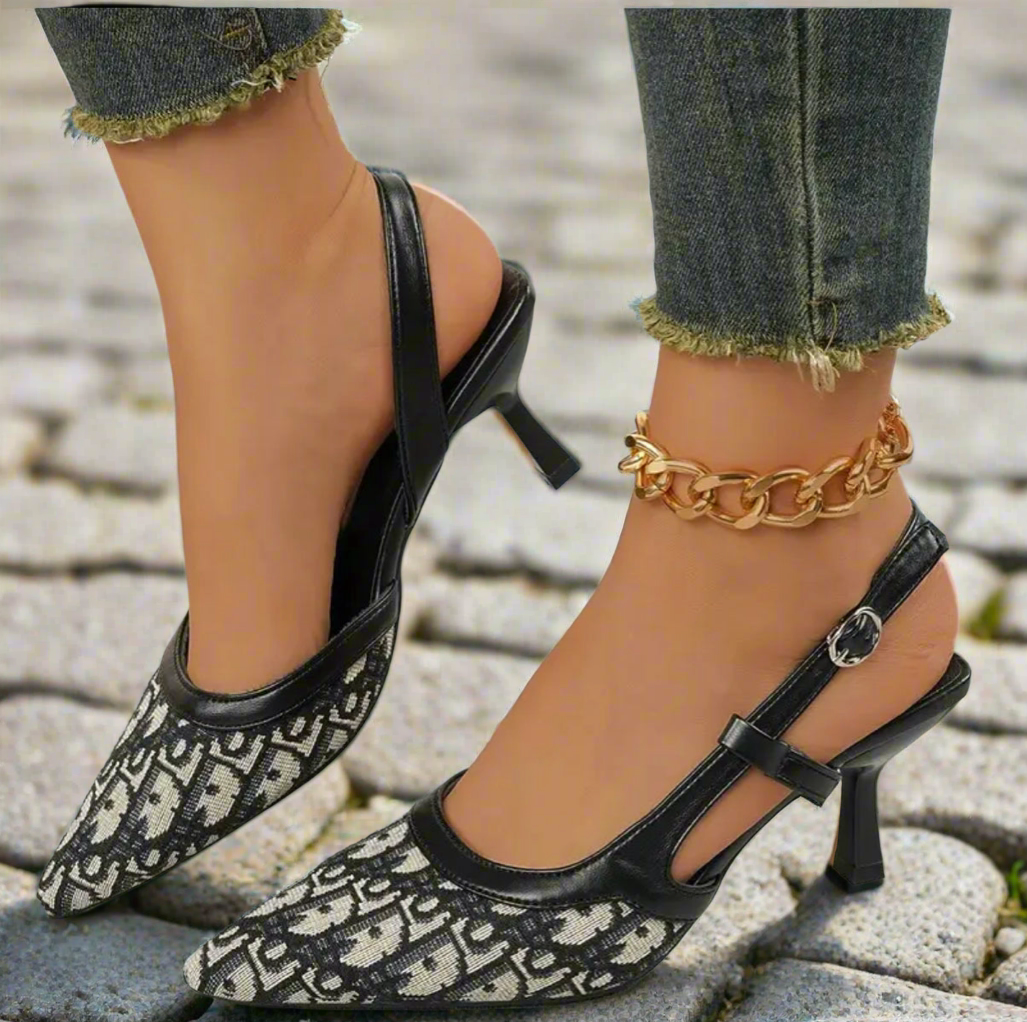 Iconic monogram patterned heels with pointer toes.
