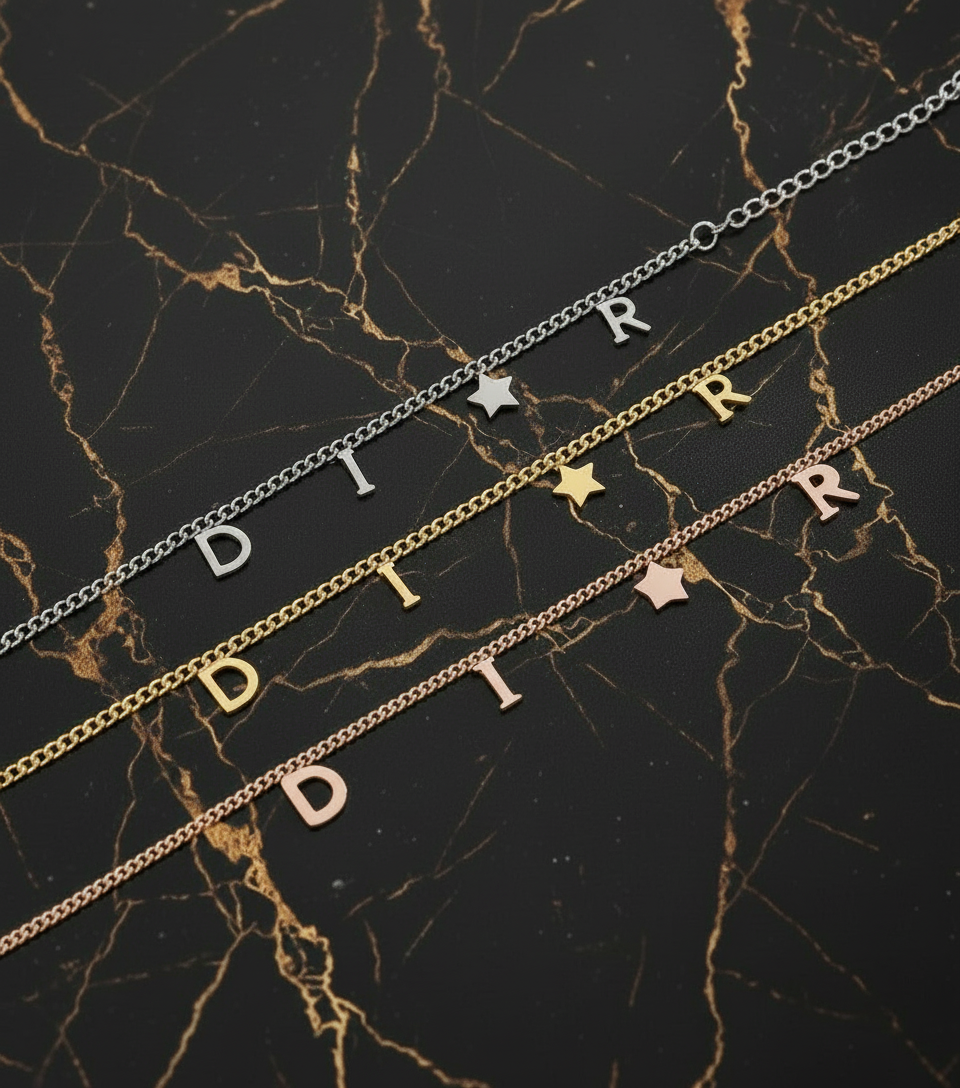 Chain jewelry in three colors: gold, silver, or rose gold. Very pretty CD dupes to add to your bracelet collection. Adjustable claw closures and star charm. Matching bracelets and necklaces.